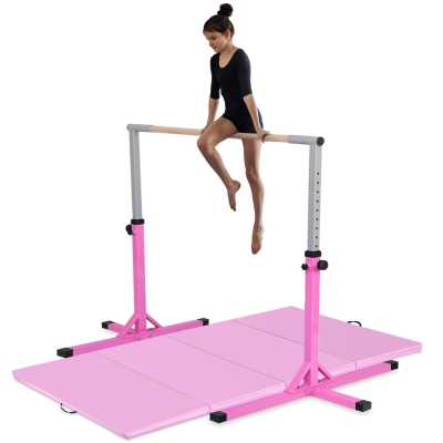 Junior Training Bar with 4ft Gymnastics Mat, 3' to 5' Height Adjustable 1-4 Levels Exercise Kip Bar